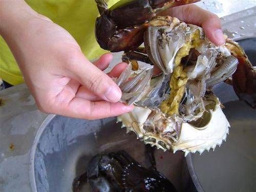 6、这个东西是螃蟹的腮,对螃蟹来说很重要(是呼吸器官),但是对我们来说不重要(不能吃),所以剪起来丢掉。