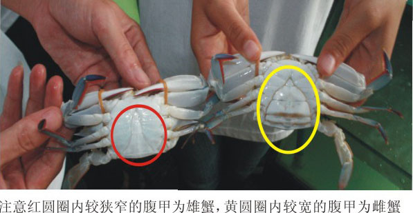辨认其雌雄的方法很简单:蟹的腹面有脐,圆脐的为雌蟹,脐大而圆;尖脐的为雄蟹,脐小而尖。要挑选背部呈墨绿色,拿起来较重者为佳。螃蟹应挑选肥大者,可用手指按蟹壳的两侧,壳坚者为丰满的肥蟹。