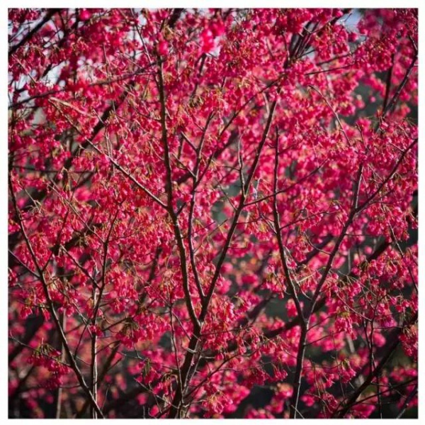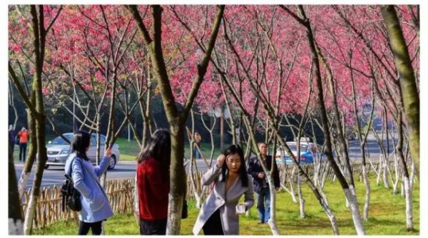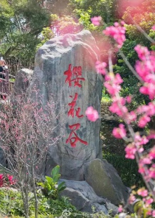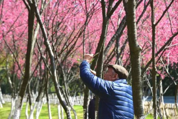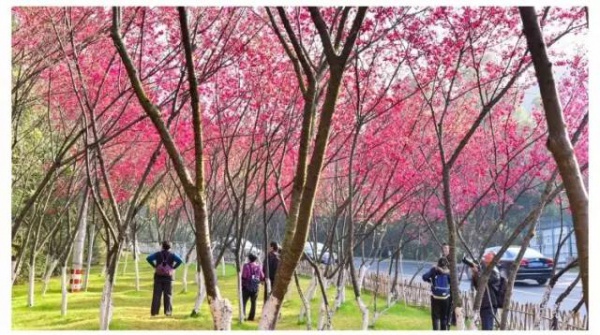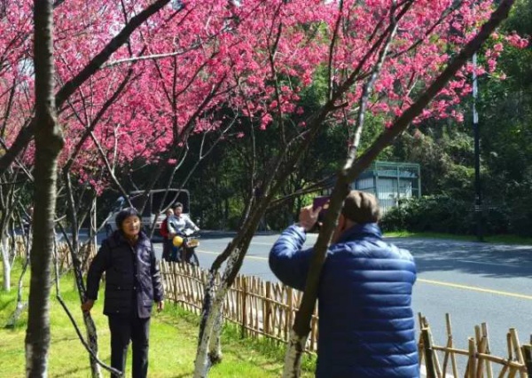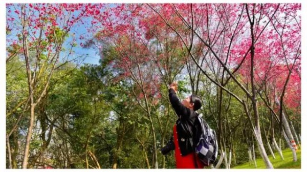 一条山道串起了两侧的山樱花,在阳光的照射下,樱花丛与游人的笑容相映红。盛开的花朵引来了不少人以山樱花为背景,留下倩影。