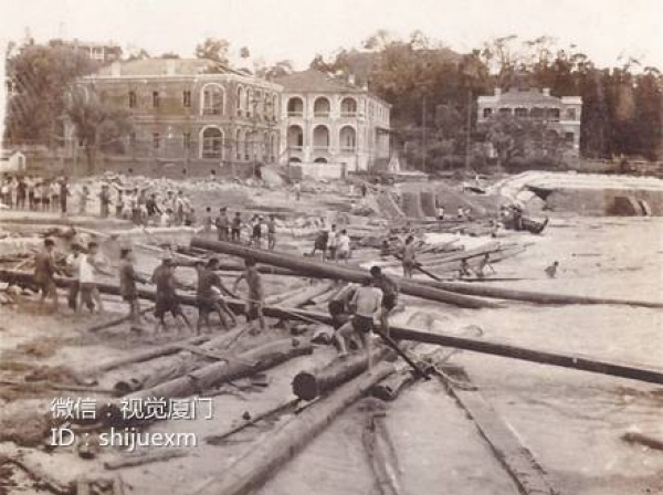 ▲鼓浪屿人民在田尾堤岸抢救木材。