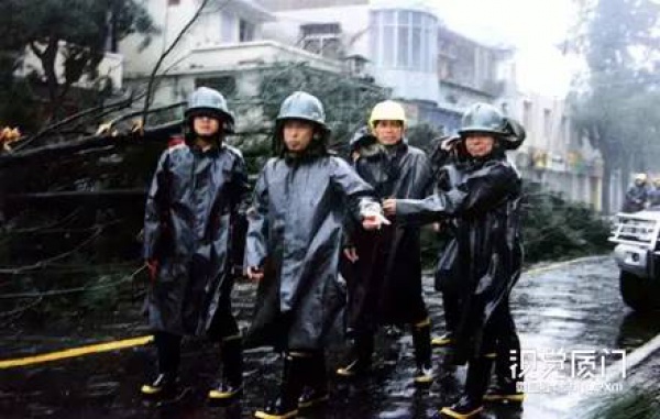 ▲市委书记、市长洪永世等市领导冒着狂风暴雨深入沿海各主要路段和单位,察看灾情。图为市领导在博物院路段顶风巡查。