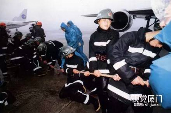 ▲台风袭来,停在高崎国际机场的数架厦航飞机被吹走,机场告急。消防特警和厦航员工一道用绳索将飞机拉住。