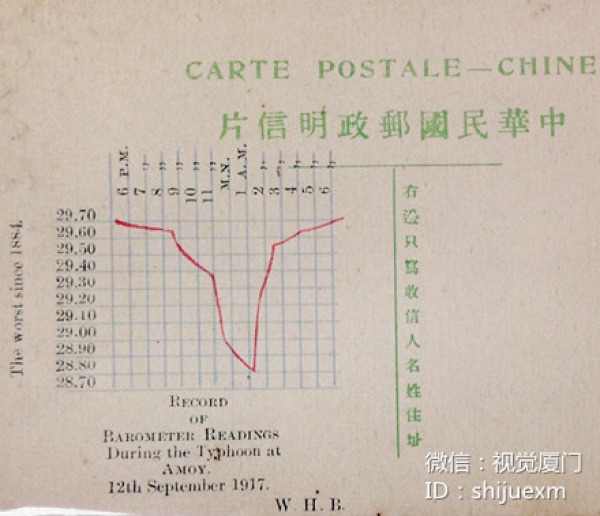 ▲1917年发行的明信片也记录下了9月12日台风时候厦门的气压计和降雨数据。