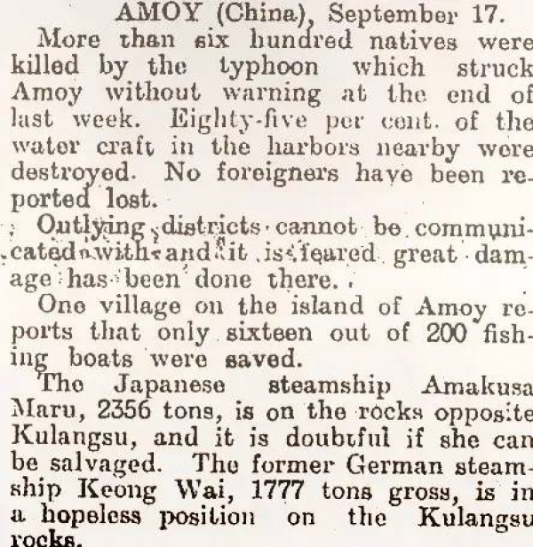 ▲新西兰《先驱报》1917年9月17日的报纸中关于厦门这场台风的报道,虽然不长但也颇为翔实:“上周,台风在没有预警的情况下突袭厦门造成当地600余人死亡。港湾附近的渔船85%被摧毁,未报道有外国人失踪。已经无法与市区取得联系,恐怕那里破坏惨重之极。厦门岛上一渔村报道200多艘渔船仅有16艘幸免于难。日本AMAKUSA号,2356吨,被冲上对面鼓浪屿的岩石上,是否能挽救难以预测。在前面的德国KEONG WAI号,重达1777吨,也无望地被刮到了鼓浪屿岩石上。”