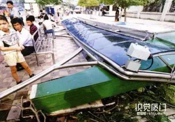 ▲中山公园南门公车候车厅顶棚的不锈钢支柱也顶不住台风。