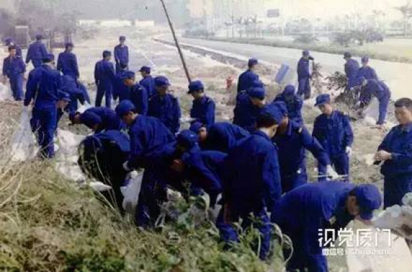 ▲十三日下午,开元区(2003年合并至思明区)三千多名少先队员在白鹭洲进行抗风赈灾。