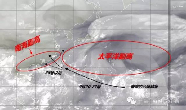 秋天的副高基本上分裂为两环,太平洋副高和南海副高藕断丝连,在台湾以东有一个若隐若现的缺口。