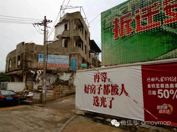 枋湖村枋湖社位于今湖里区政府西北。枋湖社从开始拆迁至今也7-8年了,进度一直缓慢。自2014年以来,枋湖社开始加大拆迁的力度,如今80%的房屋已经拆除。未来,这里规划将以居住为主,并设有完善的社区配套。枋湖的拆迁或许跟其他地方的拆迁没什么大不同,但亮眼的是拆迁范围内的一些宣传标语与一些提醒指示一改以前一个“拆”字的单调。无论是字体的选择、配色、排版上都充满了设计感,既有现代感,又有冲击力。