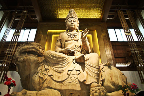 文殊师利菩萨,代表的是大智慧,圆满的智慧,绝对不是迷惑颠倒,感情用事。佛门常说:"慈悲为本,方便为门";但是又说:"慈悲多祸害,方便出下流",这个话对照起来看好像非常矛盾!其实它有道理的,因为,慈悲、方便要建立在理智的基础上,要建立在智慧的基础上,不能感情用事,不能溺爱。感情用事,不思后果,那就是祸害。如果是以智慧为基础,慈悲、方便才能恰到好处,才能善巧,才能自利利他,那是真实的功德。因此,拜菩萨,就是学习开发自己的智慧,为人处世,善巧方便,得当适宜。