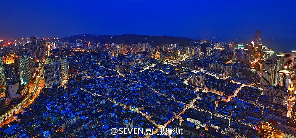 在厦门鹭江道财富中心楼顶45层直升机停机坪上俯拍厦门老城区“营平片区”。