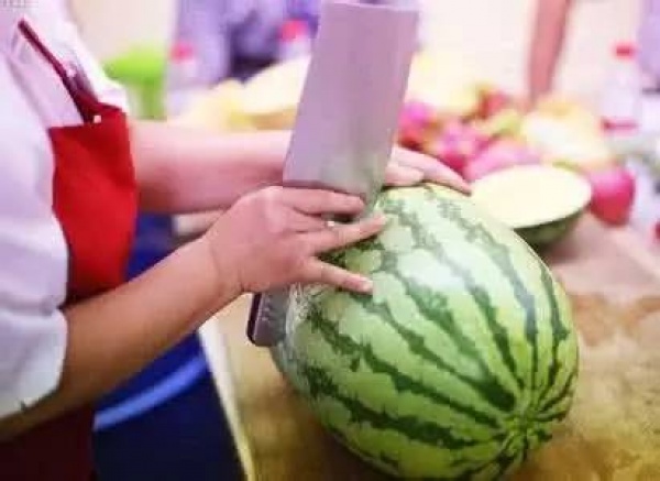 切西瓜最好使用专门的切水果刀具,尽量不要和切肉切菜的刀具混用。保证刀具和砧板的卫生,切西瓜前先用热水清洗。