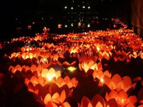 人们虔诚地把载有鲜花、银元及水 果等贡品的水灯王投放江中,紧接着大大小小莲花水灯放尾随着水灯王顺流而下,来敬奉水仙王,祈求平安,来年风调雨顺。