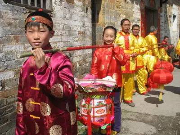 【穿脚灯】元宵灯节在漳浦等地,有一叫“穿灯脚”的习俗,即在元宵夜里,村中新娶进门的新娘子和那一年生男孩的小媳妇,必须穿红着绿,打扮一新,在婆婆或其他年岁大的老妇人陪同下,手拿吉祥物,口中说吉利语,从大祖词堂的灯棚下走过,一展风采。其所以这样做,目的在于向祖宗也向乡亲介绍新媳妇。至于已生男孩的小媳妇也过灯脚,在于告慰祖宗。