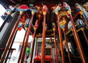 除了这些图像,香炉、灯的摆放亦有讲究,一般在庙主面前的香炉前还有个更大的香炉,为天公炉,天公在闽南的民间信仰里是一个很重要的角色,也是人们入庙的第一香所在,但它往往没有具体偶像,有的只是一个专属的香炉,庙小一点的,便和主神合用,祭拜时只需面向虚空便可,这种做法,既是古人对天的形象的保留,亦是对自然原始力量的不敢揣测。有些庙宇的天公炉会吊在庙门上,也有在庙门中央上供奉一个天地水三官的小龛,亦有的会挂上一盏长条形的天公灯,除了天公灯外,闽南庙宇最常见的灯就是挂在庙口标着庙名与神名的筒形醮灯,在游神时亦要取下装上竿子走在队伍的前方。一些级别比较高的庙宇里还有銮驾,就是以前帝王出行随驾的长杆兵器形状的礼器,有金瓜、执笔的文手、龙头杖、钺斧、戟、朝天蹬等,但一般都只能有半副,要敢有全套便是僭越礼制,且还须得有村社里的望族名门请官府册封认证过才能有,亦是刷一下居山高之远的皇帝在民间的存在感。而且多数庙宇,都是以公堂的形制来摆设,以突显道德或者神判的第二法庭的作用,你会看见等人大小的软身神像坐在案桌后头,两面是生死立场与诸多执法或者施法神像的样貌,加之一片缭绕过后的黑色滤镜,表像的威严促使着古人在这个空间里更直白地面对自己的内心。