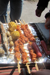 (1)烤炉、木炭、烤具、调料、参考烤料:小肥羊肉串、猪肉串、骨肉相连、鸡翅、秋刀鱼、香肠、