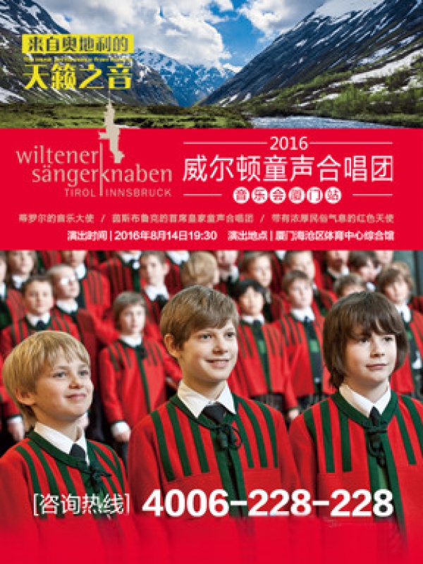 不论是“蓝色骑士”现代艺术家们的灵思,还是世界首创的空中旋转缆车,都不及这些歌唱精灵的美妙清音,更具魔力,牵引着我们飞上欧洲之巅——阿尔卑斯山,远离城市的喧嚣,融入这个神奇的冰雪世界。8月14日,奥地利皇家之州蒂罗尔音乐大使——威尔顿童声合唱团,继2014年来厦受到热烈欢迎后,再次来访,为厦门观众献上最具奥地利民族特色的音乐盛宴。
