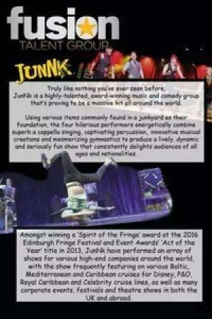 是来自英国的剧团,由四位神秘逗咖爆笑上演,他们能歌善"武",能唱会跳,关键还会演,任何破铜烂铁到他们手里都是发声的乐器。声音都来自舞台上的四个演员,生活中的废弃物摇身一变就成了舞台上的打击乐器,通过它感受经典重唱,通过它打开音乐新思路!