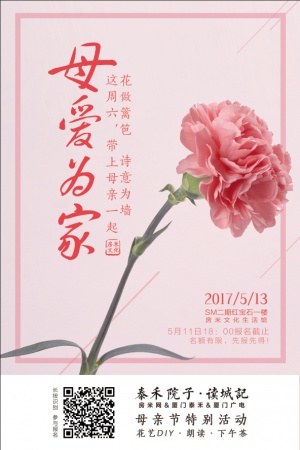 好消息,5月13日(周六)下午,母亲节特别活动「母爱为家」邀您读给妈妈听。让爱和思念在朗读的时光中生根发芽;把花和下午茶在房米文化生活馆送给妈妈!