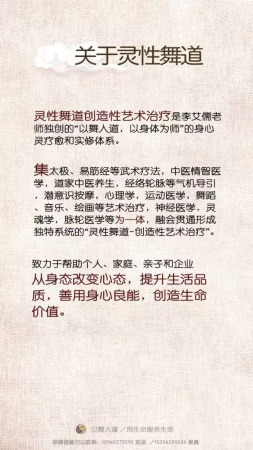 灵性舞道是李艾儒老师独创的“以舞入道,以身体为师”的身心灵疗愈和实修体系。集太极,易筋经,中医情志医学,中医经络养生,脉轮等气机导引,潜意识按摩,心理学,运动医学,舞蹈,音乐,绘画等艺术治疗,神经医学,灵魂学,脉轮医学等为一体,融会贯通用方便锻炼的方式形成独特的本土化创造性艺术治疗体系。致力于帮助个人、家庭、亲子和企业改善身心健康,提升生命品质,创造价值。