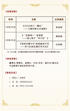 参会对象:董事长/理事长、监事长、行长/主任、副行长/副主任、中层管理干部及优秀骨干等。