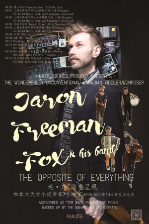 由独立厂牌HazeSounds(迷·声)主办、加拿大艺术署推介,天才小提琴家/作曲家Jaron Freeman-Fox将携乐队The Opposite Of Everything来到中国进行为期18天的首度中国巡演。乐队此行将亮相上海世界音乐节、深圳Oct-Loft爵士节、赤水国际音乐节等众多国内知名音乐节,并在北京、舟山、广州、澳门、厦门等城市进行专场演出。