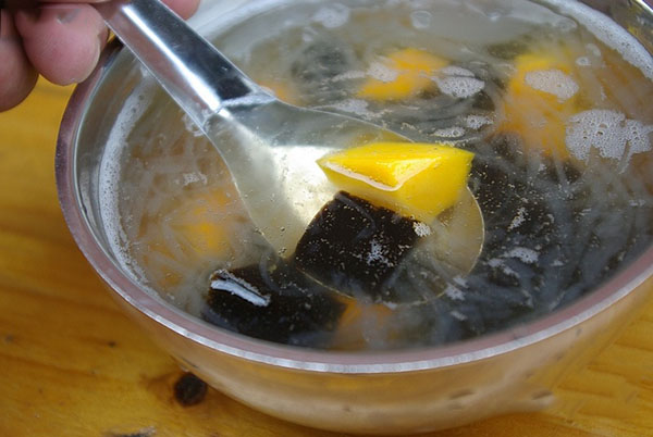 厦门石花膏的主要原料石花菜,是生长在台湾海峡中潮或低潮一些带礁石上的一种食用海藻,藻体平卧,为不规则的叉状分支,形状看上去颇似珊瑚,很漂亮雅观。石花膏是用纯手工制作的,要先以大锅熬制石花草,后用纱布过滤,冷却后自然凝固像果冻,透亮清澈,食用时可加入蜜水、糖水。在厦门天热之时食之可清凉降火气。