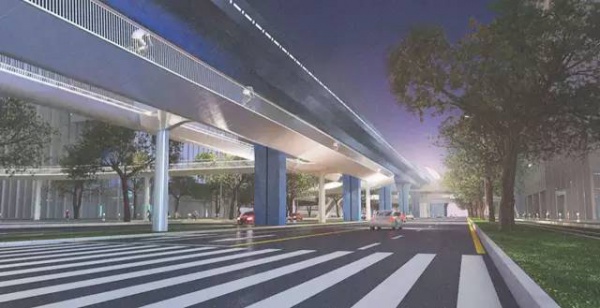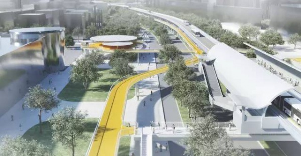 在BRT高架桥下两侧将架起两条新高架桥,作为专属的自行车道,形成一个独立的骑行系统。自行车道断面主要沿BRT两侧布置,单侧单向两车道,净宽2.5米,总宽2.8米;合并段净宽4.5米,总宽4.8米,采用钢箱梁结构。