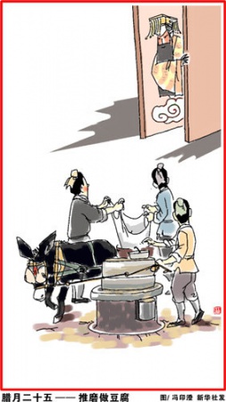 腊月二十五(1月22日),推磨做豆腐。传说玉帝会下界查访,吃豆腐渣以表清苦。