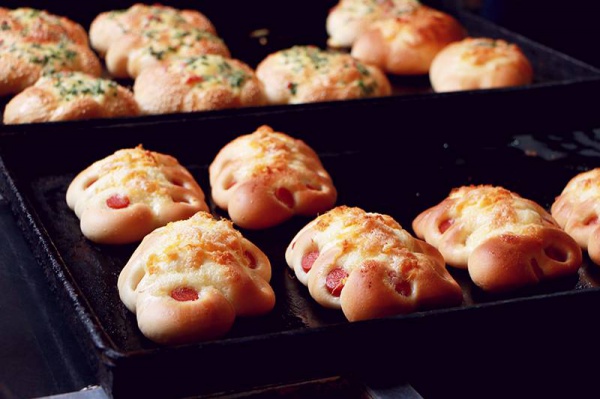 五指面包烤得很松软,黄澄澄的果酱就是那股熟悉的怀旧味道;鸡腿包的口感松软,里面有一根完整的火腿肠。