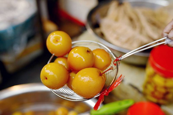 阿婆的普通话不错,她说这些蜜梨用盐、冰糖等腌制,连里面的果肉都腌制得晶莹剔透,十分润肺消火,特别适合现在的季节食用,一斤12元。