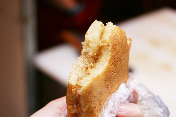 这是一块八市内让人流连的满煎糕,特制的面糊铺满巨型饼铛,洒满白砂糖和炒熟的花生碎,在正中对折成一个完美的半圆,把甜美都包覆在中间。