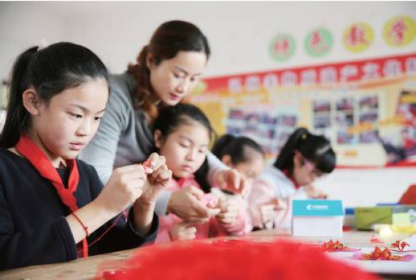 洪丽娜在洪厝小学义务教孩子们制作春仔花。