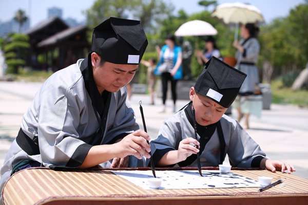 活动最具吸睛的是将文化溶于情境之中,以中华教育岛——国内首个以中华教育为主题的历史文化园林为场地,策划了学习毛笔字、活字印刷术、成语故事情景表演和制作粽子等浓浓中国风课程。