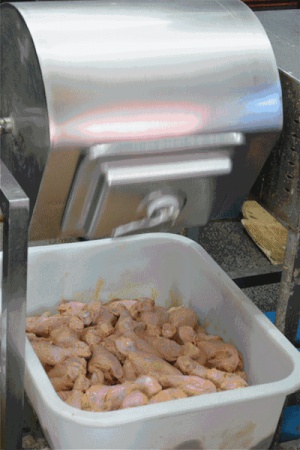 经过机器裹粉的鸡腿,鸡腿们都被均匀的上了层面糊浆,这样的鸡腿儿炸完会带着一层薄而脆的酥皮,那滋味谁吃谁知道。