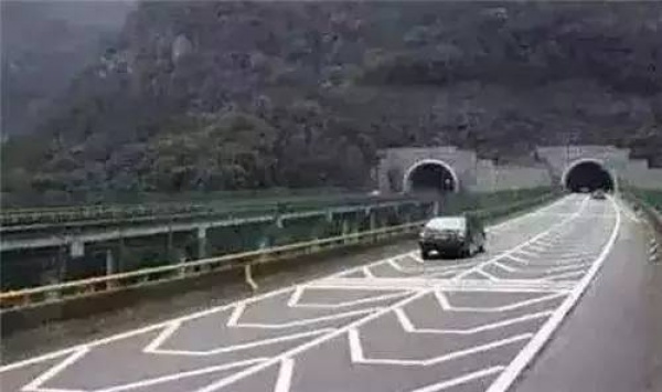 在隧道口,我们经常看见这种标线。它一般开始于隧道外200米,一直延伸到隧道内100米,是提醒你减速慢行的标志。为什么呢?因为隧道口内外,光线差别很大,驾驶员一时间难以适应,当然要减速慢行了。