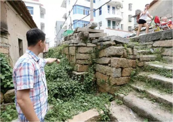 鹤浦路,目前也就这条路右侧,还有当年留下的片段古城墙了,总共有三处。其中,比较完整的一段,约莫10米长,由石板垒成,藏身于杂草丛中,只见石头缝里的青苔苍苍,极其隐蔽。