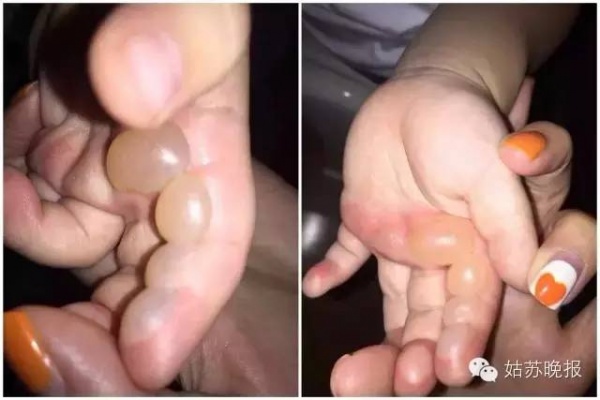 结果“哇”的一声叫出来,孙女士赶紧买了瓶水为孩子降温,十几分钟后,手掌上竟然起了四、五个大水泡,最大的一个有弹珠那么大。