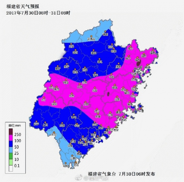 30日,全省有暴雨,宁德、福州、莆田、泉州、三明五市、平潭区和龙岩北部有大暴雨,其中宁德、福州两市的局部有特大暴雨。