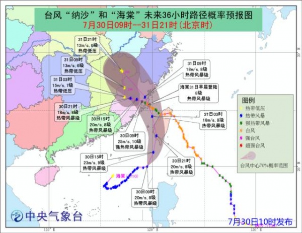 预计,“海棠”将以每小时30公里左右的速度向东北转偏北方向移动,强度将有所加强,30日晚上登陆台湾南部沿海后,将于31日早晨在福建霞浦到晋江一带沿海再次登陆(热带低压或热带风暴级,7-8级,15-20米/秒)。登陆福建后,强度迅速减弱,31日晚上将与台风“纳沙”减弱后的残余环流合并北上。