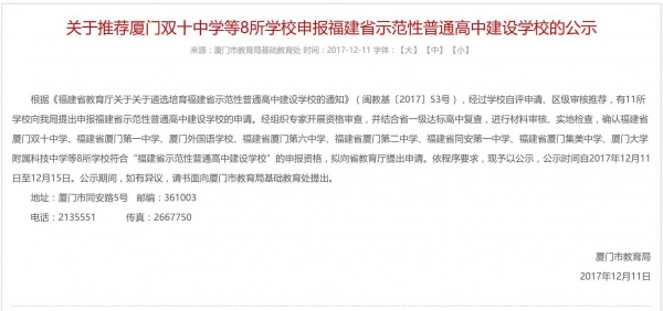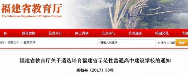 各地推荐65所,其中厦门推荐8所;再从65所中选出50所建设学校,四年后,再从50所认定35所为“省级示范性高中”。