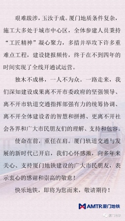 【快乐地铁感恩有您】厦门地铁1号线将于2017年12月31日上午10时开通试运营" title="【快乐地铁感恩有您】厦门地铁1号线将于2017年12月31日上午10时开通试运营" />