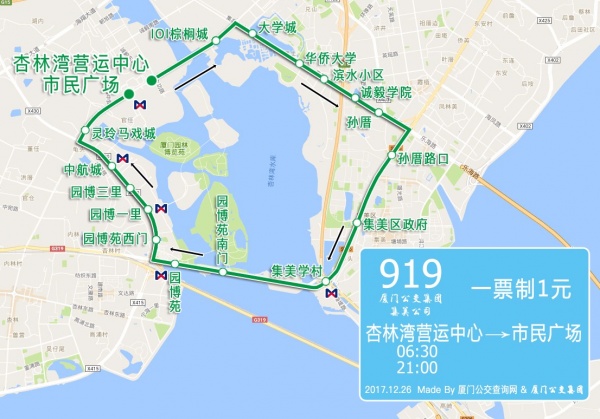 新增集美区内919路环线,进一步方便杏林湾片区市民的交通出行,接驳轨道交通1号线集美学村、园博苑等站点。