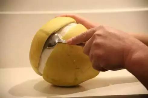 2、用铲子沿着柚子皮的边缘,一点点地“翘”开,直到把整个柚子都剥出来为止。