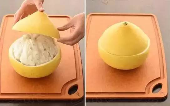 3、柚子吃不完,可以再把它放回到柚子皮里,然后盖上盖儿,这样柚子不容易干了。