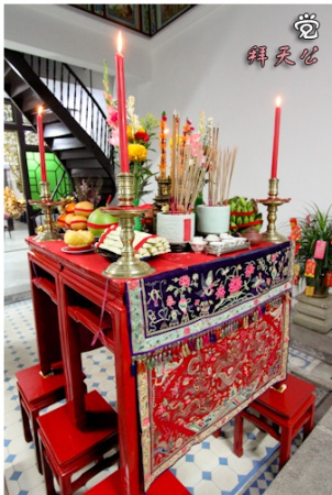 供桌供桌较特别,需设顶桌和下桌(或前后桌),一般是以长板凳或矮凳将八仙桌垫高,八仙桌脚下分别置放四迭寿金(金纸头得朝门口,就像人敬神时的方向),此即为顶桌,下方前面再加放一张供桌,即为下桌。顶桌前再系上吉祥图案的桌围,并在顶桌两旁系上头带尾青的甘蔗,两只甘蔗头尾青部分再以红线系在一起,两来可加挂高钱(又称长钱)垂在两侧,并准备三只或五只代表天公的天公座(灯座)摆在顶桌中间,中央再摆上香炉,炉之两旁并备好烛台。