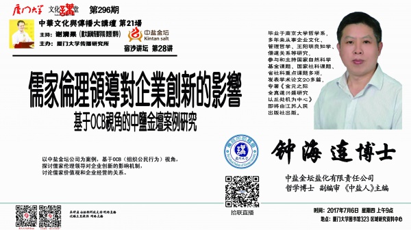 7月6日上午,文化讲堂(296)钟海连:儒家伦理领导对企业创新的影响:基于OCB视角的中盐金坛案例研究