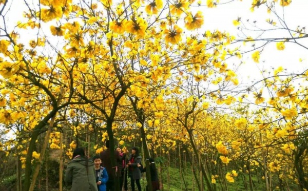 (4)13:00-抵达黄花风铃木林,穿梭黄色风玲木花海之中,赏尽满园春色,道路两旁的黄花风铃木随风舞动,枝头一串串“风铃”披着黄色舞衣,在湛蓝的天空下摇曳生姿,仿佛置身仙境。