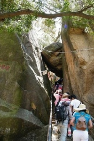 这里有一块巨石,开裂为两半,中间自然形成一条狭窄的小路,砌有石阶,称为“云梯独步”。与一般寺庙殿堂纵向布局不同,云盖寺依山就势,倚着石壁并排建成左、中、右三殿。大雄宝殿居中,两边分别是大悲殿和西方三圣殿。